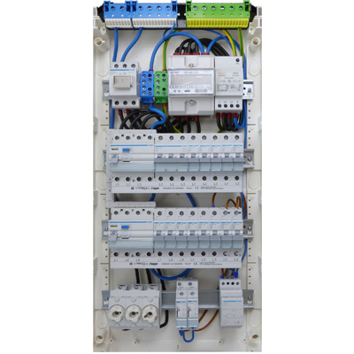 Kleinverteiler für den Wohnungsbereich mit verschiedenen Ausstattungen wie Hauptschaltern, Stromstoßschaltern, Unterzählern und den notwendigen Komponenten zum Schutz vor Überspannung (T2)