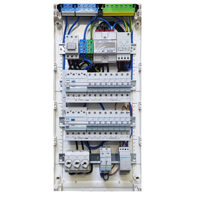 Kleinverteiler für den Wohnungsbereich mit verschiedenen Ausstattungen wie Hauptschaltern, Stromstossschaltern, Unterzählern und den notwendigen Komponenten des Überspannungsschutzes